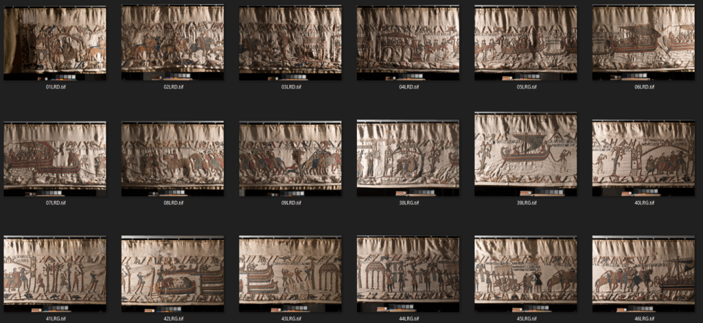 Concrètement, cette opération a permis d’obtenir une couverture complète de la face de l’œuvre, en haute définition (chaque cliché au minimum à 4000 x 6000 pixels) en lumière directe, en lumière rasante, en réflexion infrarouge et en fluorescence d’ultraviolet. La campagne de prise de vue s’est déroulée sur 13 journées du 3 au 24 janvier 2017 pendant lesquelles Antoine Cazin, responsable de l’imagerie scientifique, et Guillaume Debout, chef du pôle, ont réalisé 1216 clichés. De plus, 6 détails ainsi qu’un fragment conservé à la médiathèque de Bayeux et son écrin ont fait l’objet de plusieurs clichés. Enfin 16 zones de détail ont fait l’objet au total de 618 clichés sous des lumières d’incidence variable qui ont permis de générer 16 fichiers RTI.